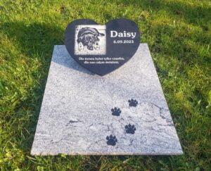 Na zdjęciu widzimy kamienny pomnik w kształcie serca, który jest hołdem dla ukochanego psa o imieniu Daisy. W górnej części kamienia umieszczono okrągłą tabliczkę z fotograficznym portretem Daisy, a poniżej wygrawerowano jej imię oraz datę. Inskrypcja głosi: “Dla świata byłaś tylko cząstką, ale… Dowiedz się więcej: Daisy – więcej niż przyjaciel - Dęby pamięci