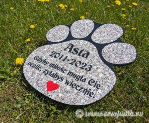 Przedstawiamy granitową płytę w kształcie łapy Asta, która jest nie tylko symbolem trwałości, ale i miłości, jaką darzymy nasze zwierzęta. Cztery zaokrąglone poduszki i jedna większa na dole płyty, reprezentujące łapę, zostały wyrzeźbione z dbałością o każdy szczegół. Na płycie wygrawerowano imię “Asta”… Dowiedz się więcej: Pamiątka, która Przekracza Czas: Płyta w kształcie łapy Asta - Serce pełne wspomnień: Pamiątka dla Lucky’ego Nagrobek dla psa w kształcie serca ze zdjęciem porcelanowym