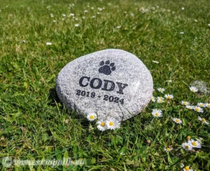 W naszej pracowni postanowiliśmy uczcić pamięć Cody’ego w wyjątkowy sposób. Wybraliśmy piękny granitowy głaz o naturalnych odcieniach. Na powierzchni głazu wykuliśmy imię “CODY” oraz lata jego życia: 2019-2024. Obok imienia umieściliśmy odcisk łapki aby zaznaczyć że był to czworonożny przyjaciel. Personalizacja i Dodatkowe… Dowiedz się więcej: Granitowy głaz jako nagrobek dla psa Cody - Pamiątka, która Przekracza Czas: Płyta w kształcie łapy Asta