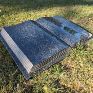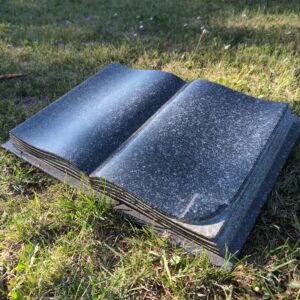 Den mørkegrå mindebog i granit er en elegant og holdbar måde at mindes en elsket på. Fremstillet af poleret granit, fås den i to størrelser: 40 × 30 cm og 50 × 35 cm. Bogen er velegnet til placering på en gravplade eller som et fritstående mindesmærke.